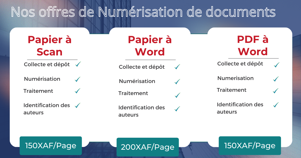 Nous vous accompagnons dans cette phase avec trois offres à savoir la transformation vos documents du format papier au format Image(Scan), au format .docx(word) et du format PDF au format .docx(word).