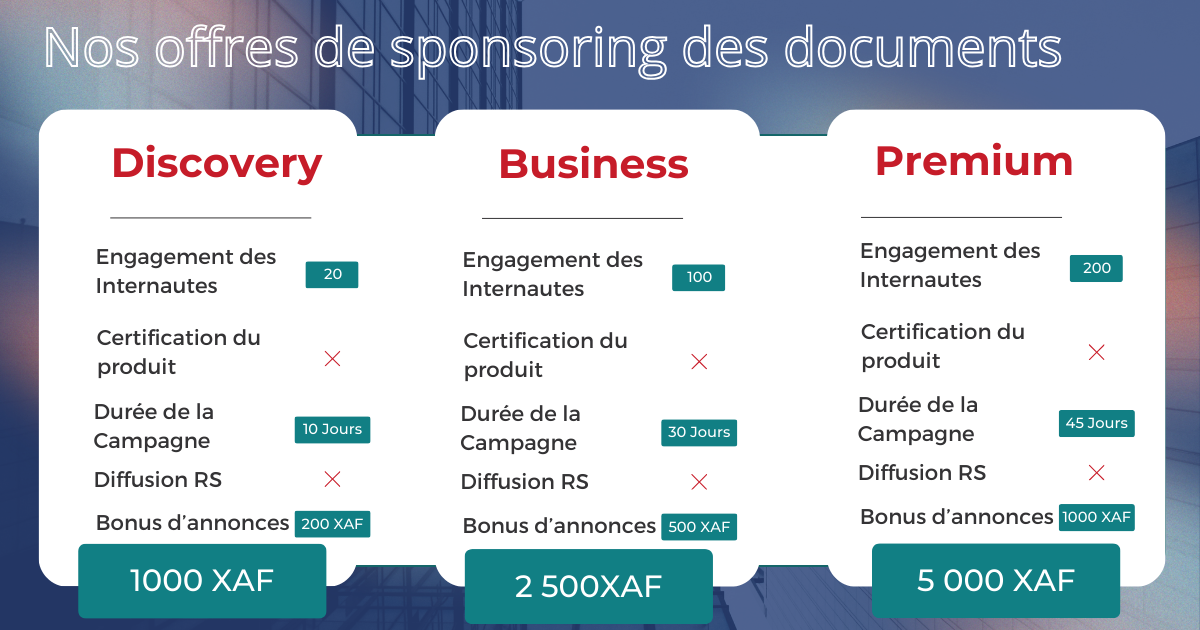 Garantissez la vente et le téléchargement accélérés de vos documents en souscrivant à nos offres d’accompagnes qui lancent automatiquement le sponsoring des campagnes de vente sur Gloobest et sur AFH Ads qui sont nos plateformes d’annonces ainsi que sur d’autres réseaux sociaux telsque Facebook, Google et sur des blogs professionnels avec un suivi permanent avec un rapport d’audience instantané.